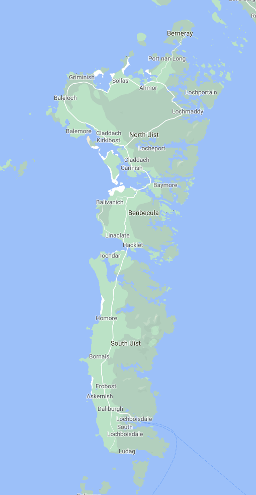 We went about as far away as we could without leaving the country: the Outer Hebrides in the extreme west of Scotland. I drove via Manchester, Fort William, Mallaig, Ferry to Lochboisdale. JJ flew via Glasgow.
