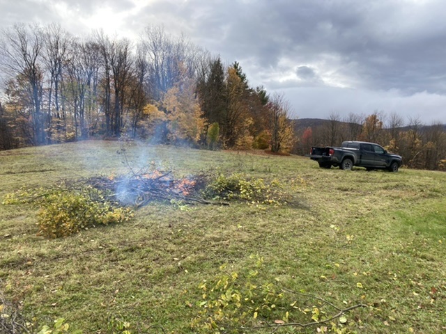 Brush-hogging is basically attaching a gigantic mower blade to the back of a tractor and using it to cut brush — grass, shrubs, small trees — down in fields. We do this every 1-3 years in the fields on our property otherwise they would fill in and no longer be fields. We hire someone to do this. We don’t have a tractor.