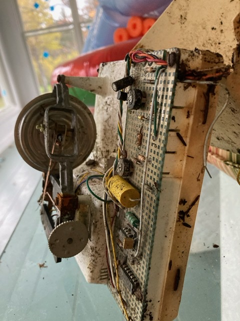 Old plastic case with some wires, half-buried in dirt and leaves. Inside…